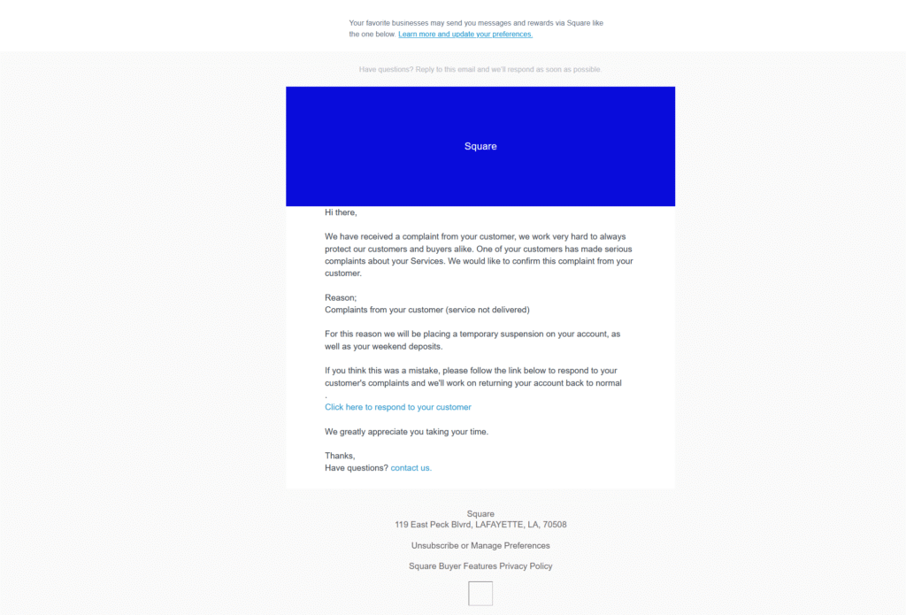 At first glance, the email appears legitimate. The branding mimics Square’s tone, it includes typical phrasing like “protect our customers and buyers alike,” and it even uses a Lafayette, LA address and links to privacy policies — all tactics used to build trust.